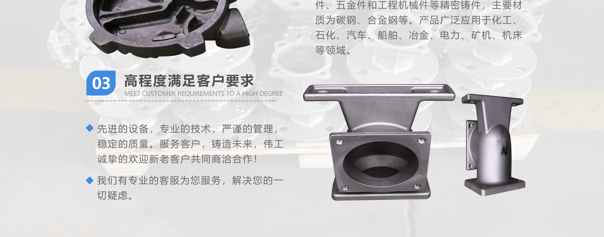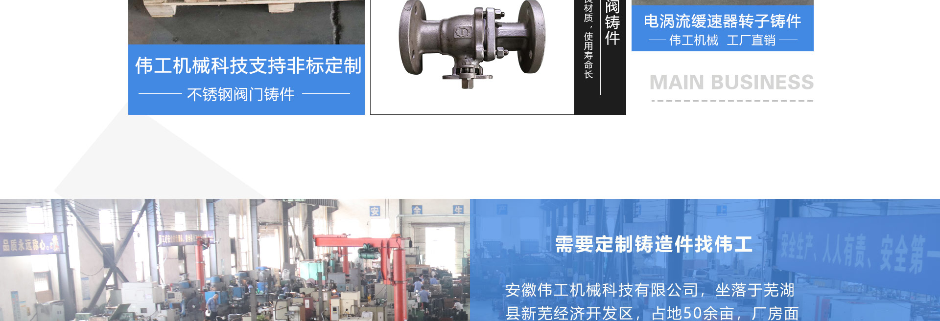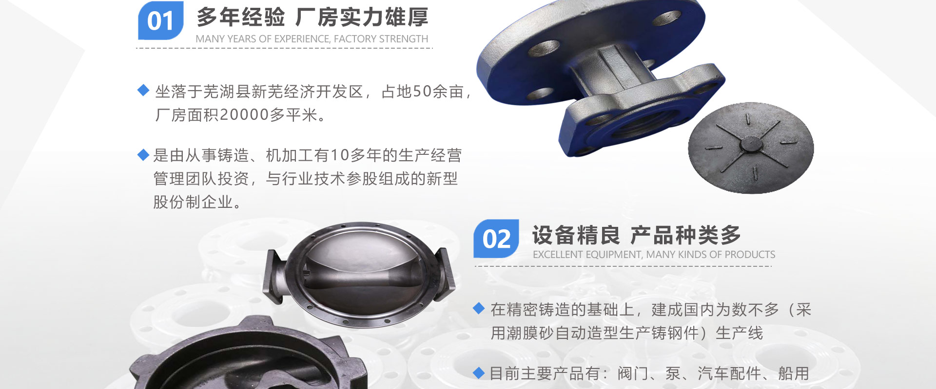 安徽偉工機械科技有限公司,坐落于安徽蕪湖新蕪經(jīng)濟開發(fā)區(qū),是一家専業(yè)從事鑄造產品設計、研發(fā)、生產、銷售于一體的企業(yè),公司為客戶的產品提供多樣的技術支持與設計,公司主要鑄造技術有潮模砂鑄造、硅溶膠精鑄工藝。主要產品有:不銹鋼閥門配件、泵閥配件、汽車配件、工業(yè)管道配件、工程機械配件、汽車配件等。材質為:低合金鋼、304、316、316L、鉻鉬鋼、哈氏合金、碳鋼、雙相鋼等。公司已先后通過ISO9001和TS16949等多種體系審核,以完備的管理手段和齊全的檢測設備滿足客戶需求,進的設備,専業(yè)的技術,嚴謹?shù)墓芾恚€(wěn)定的質量。服務客戶,鑄造未來,偉工誠摯的歡迎新老客戶共同商洽合作